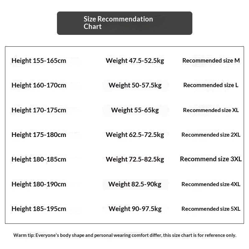 Sizes: M, L, XL, 2XL, 3XL, 4XL, 5XL
